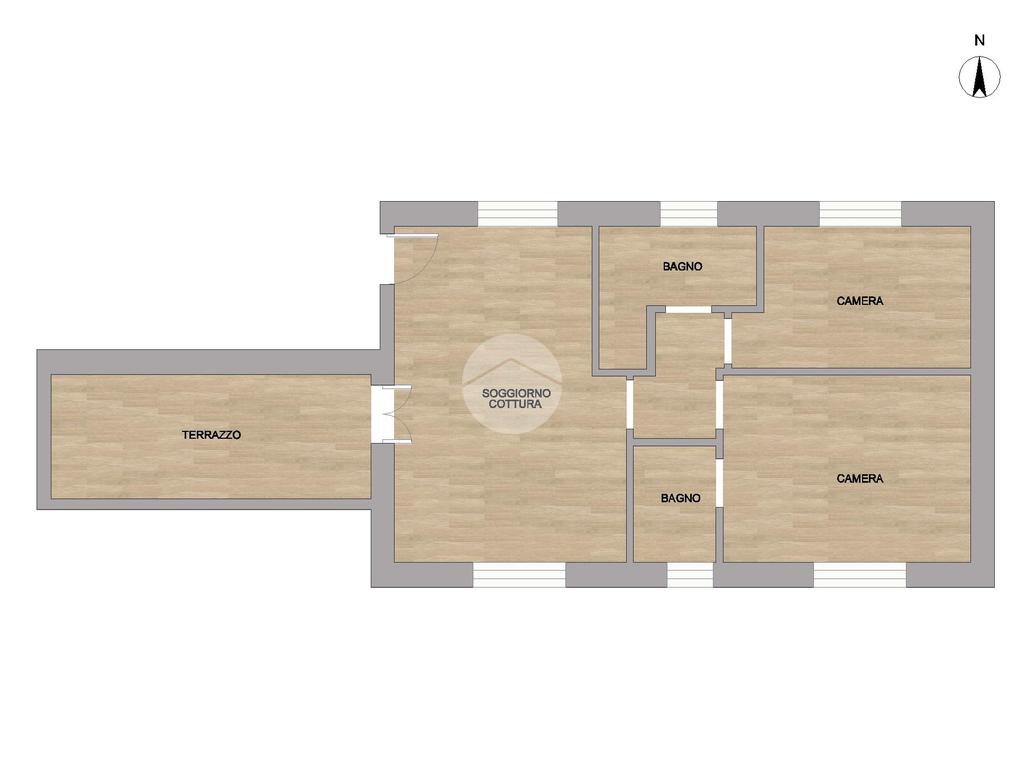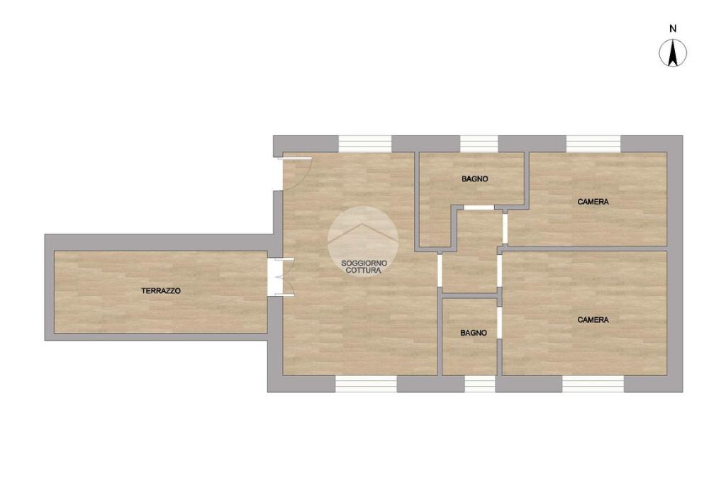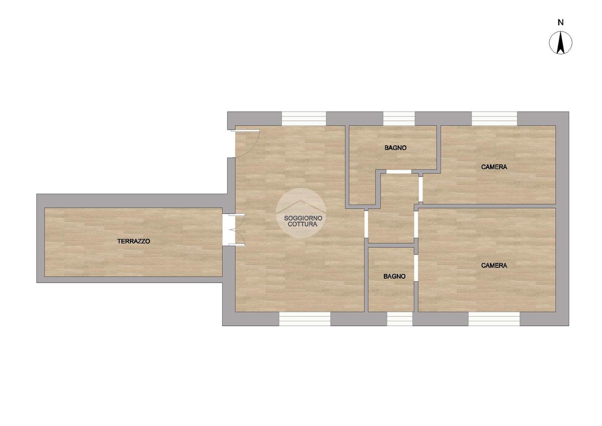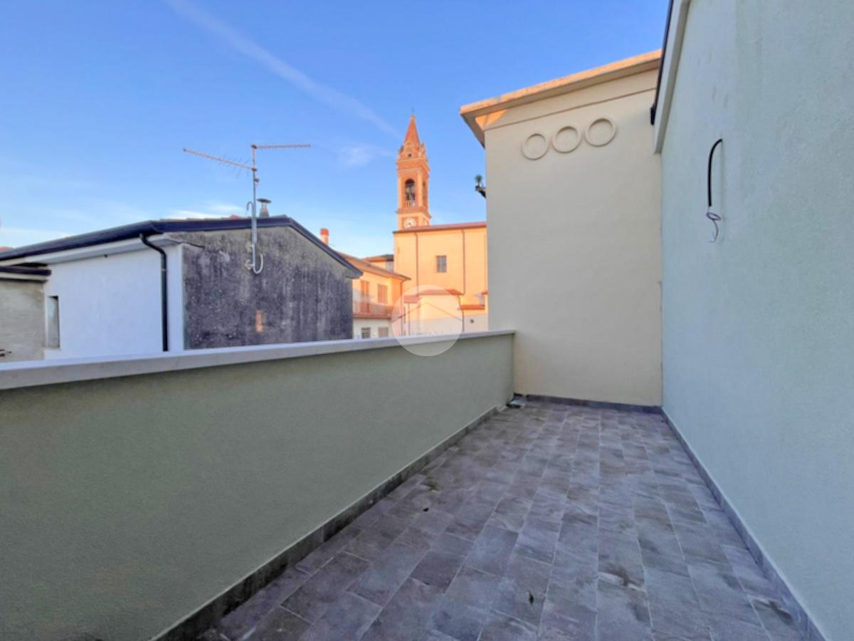 L'accesso principale dell'immobile si apre in un ampia zona giorno open space dalla quale si accede al terrazzo di circa 21 mQ
