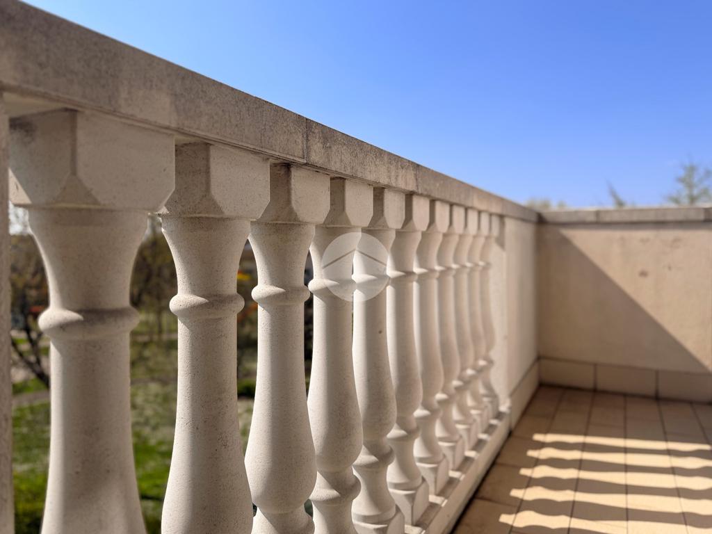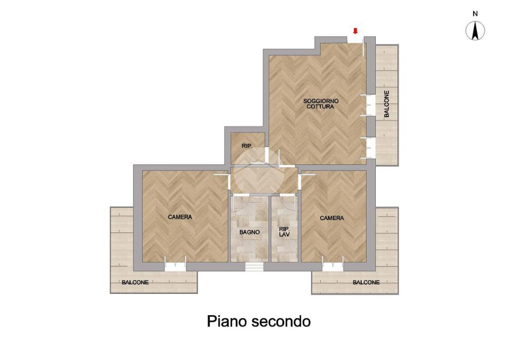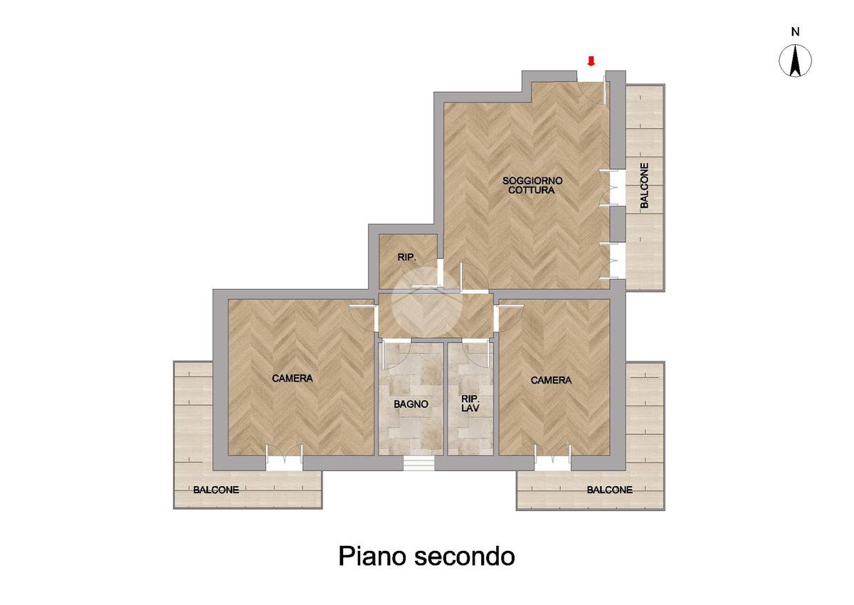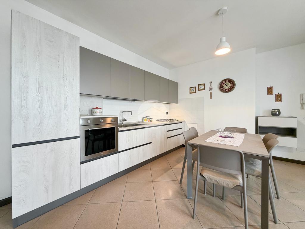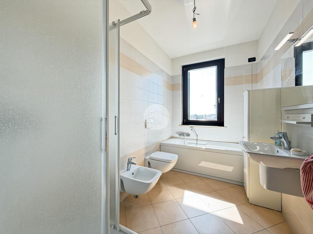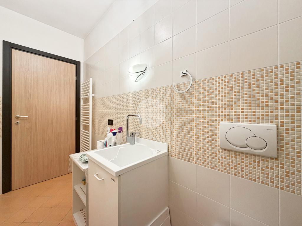 L’ingresso si apre sulla zona giorno, caratterizzata da un soggiorno con cucina open space e accesso diretto al balcone. Attraverso un disimpegno si accede alla zona notte, composta da due spaziose camere: una matrimoniale e una doppia, entrambe con uscita sul balcone. Infine troviamo un bagno finestrato dotato di box doccia e vasca, e una lavanderia completa di servizi.