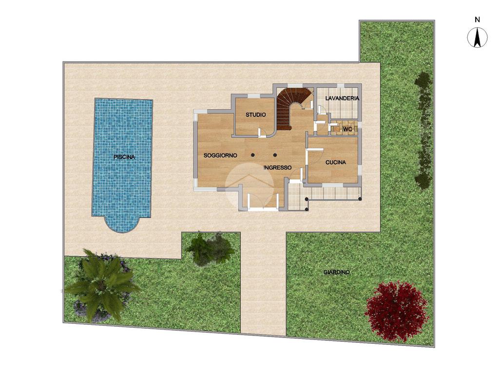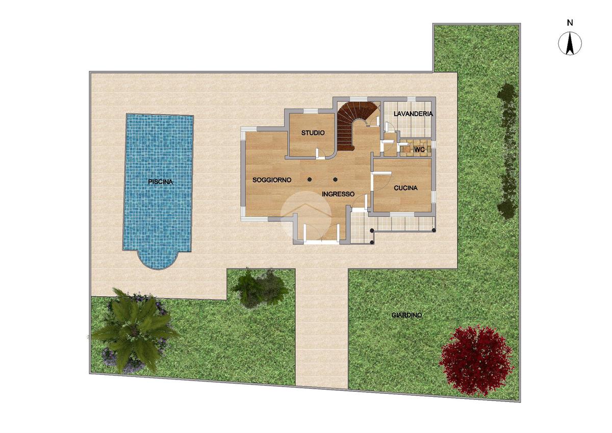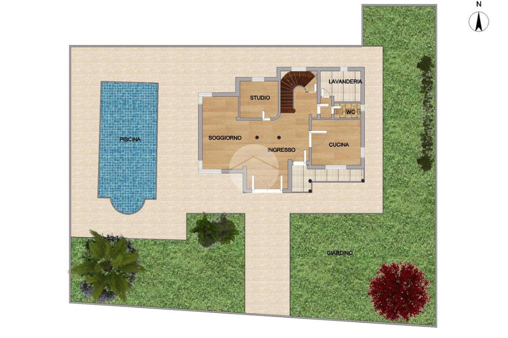 Ingresso – Soggiorno – Cucina – Quattro camere – Studio – Cinque bagni – Lavanderia – Guardaroba – Taverna – Garage doppio – Piscina