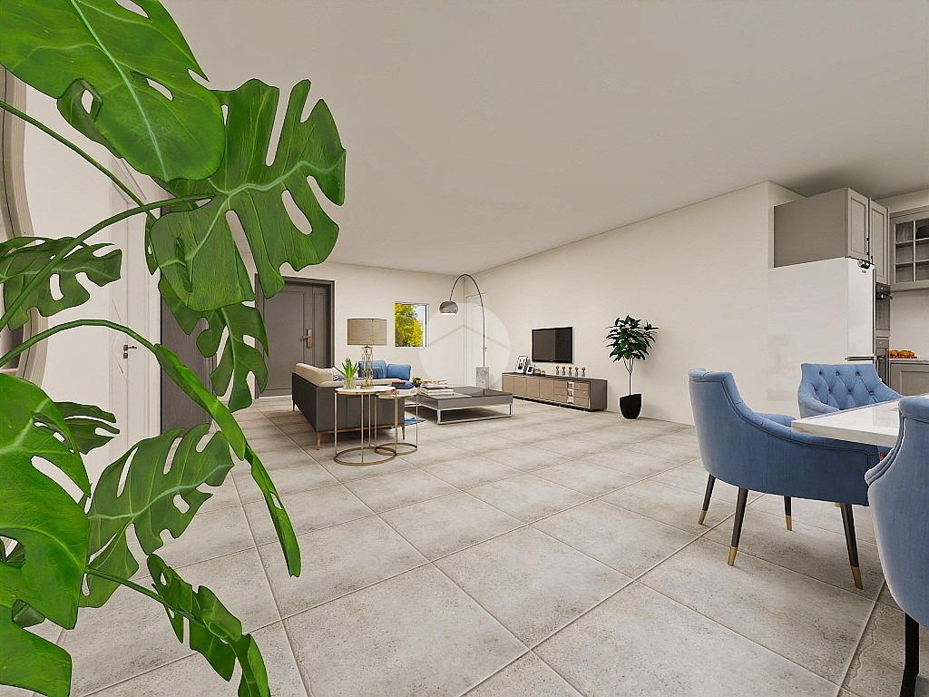 L’ingresso si apre sull’ampia zona living di circa 50 mq, un ambiente luminoso e arioso grazie alle grandi vetrate che affacciano sul giardino esclusivo di 140 mq, perfetto per vivere la casa anche all’esterno e godere di privacy e relax.